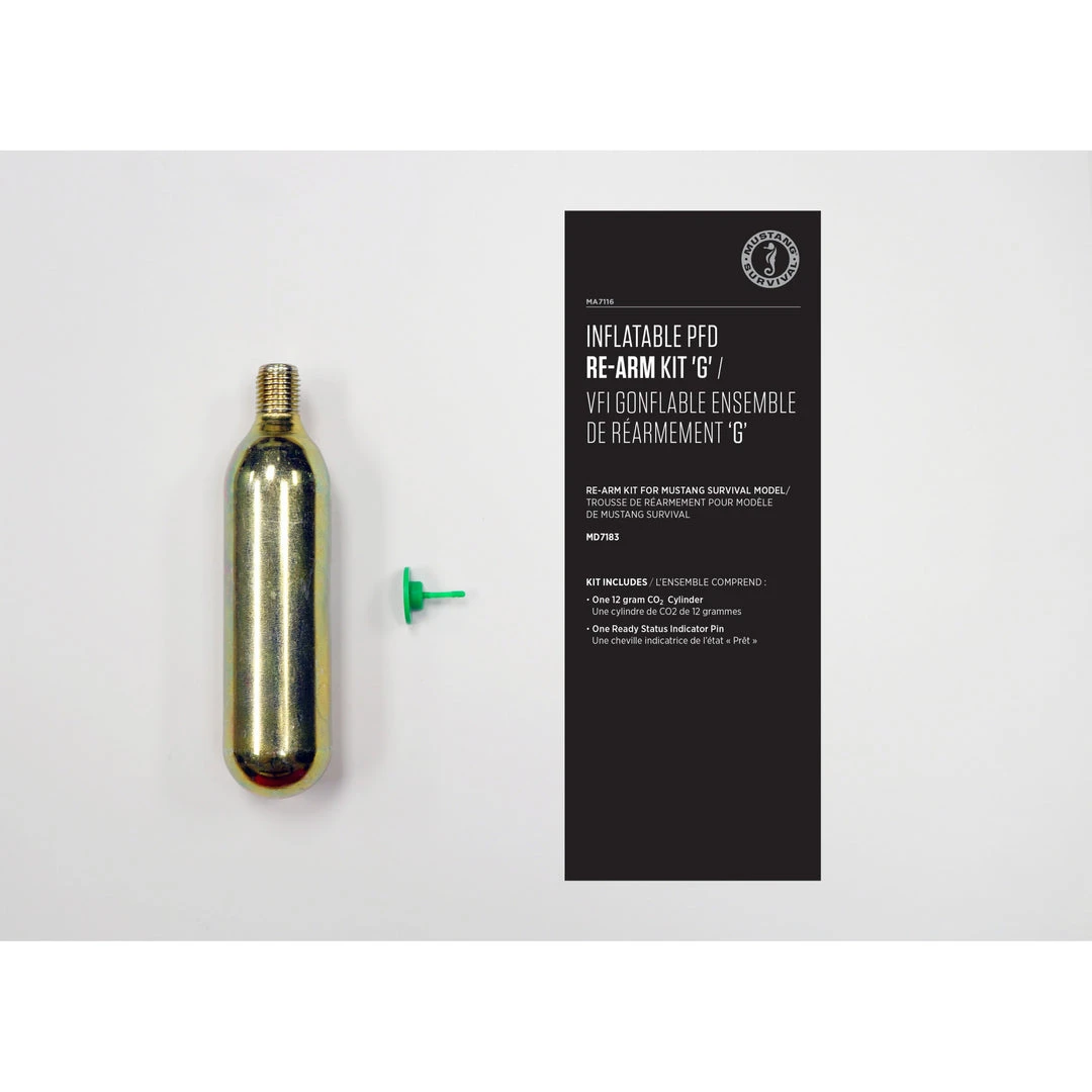 The 12g manual Re-arm Kit contains everything necessary to re-arm your Mustang Survival Khimera PFD after deployment. Use only Mustang Survival re-arm kits. Use of other re-arm kits may result in improper operation or failure to operate and will void the product’s warranty. For the Khimera dual flotation PFD (model number MD7183).