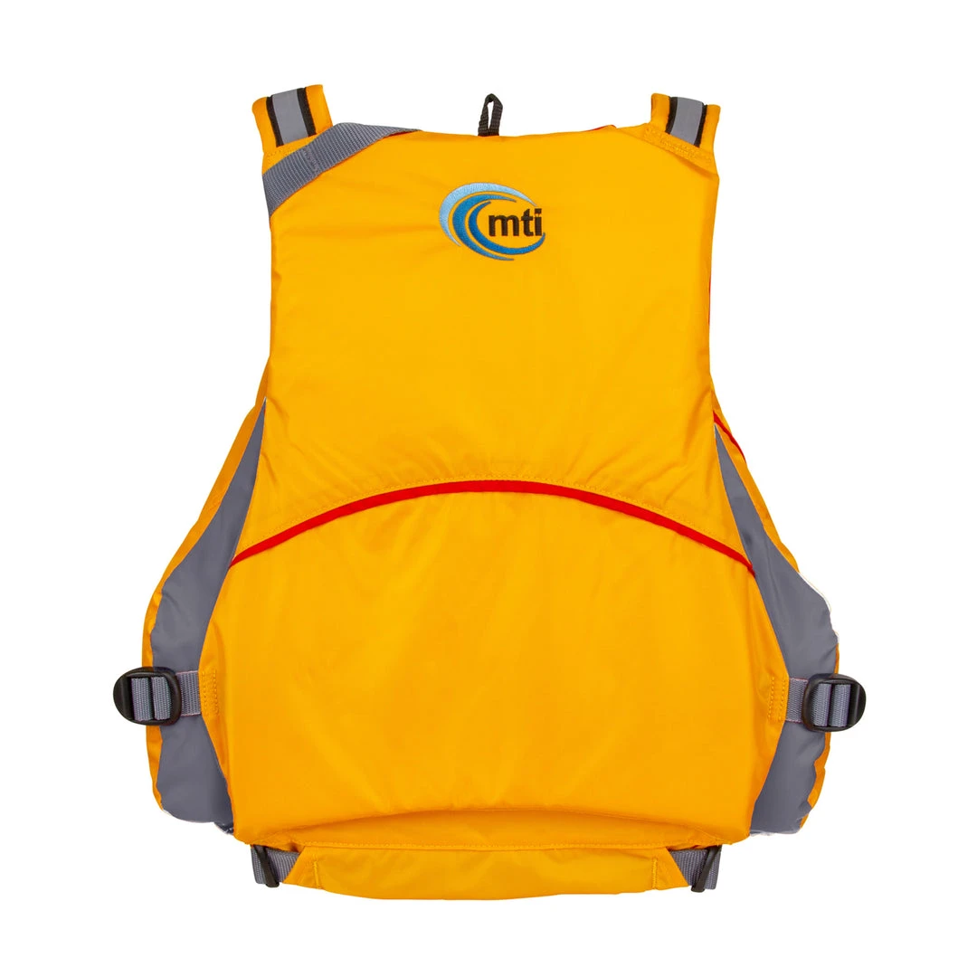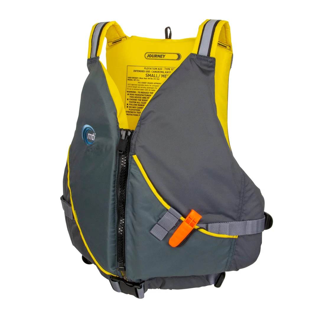 The Journey is a lightweight, low-profile PFD built with a flexible and soft EPE/PE and PVC foam in contoured front panels. Open sides keep you cool and give you wide range of movement. The Journey also features a large storage pocket with hook and loop closure and a webbing loop on the back for a hydration pack or light. Safety features include a tethered signal whistle and reflective trim on the front, back, and shoulders of the PFD.